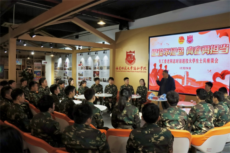 为充分发挥退役大学生士兵的先锋模范作用,更好关心下一代工作,12月26日,福建师范大学协和学院在学院创和园举办“退役不褪色,青春勇担当”关工委老同志对话退役大学生士兵座谈会,学院关工委主任寇伟、八一学社30名退役大学生士兵共同参加。